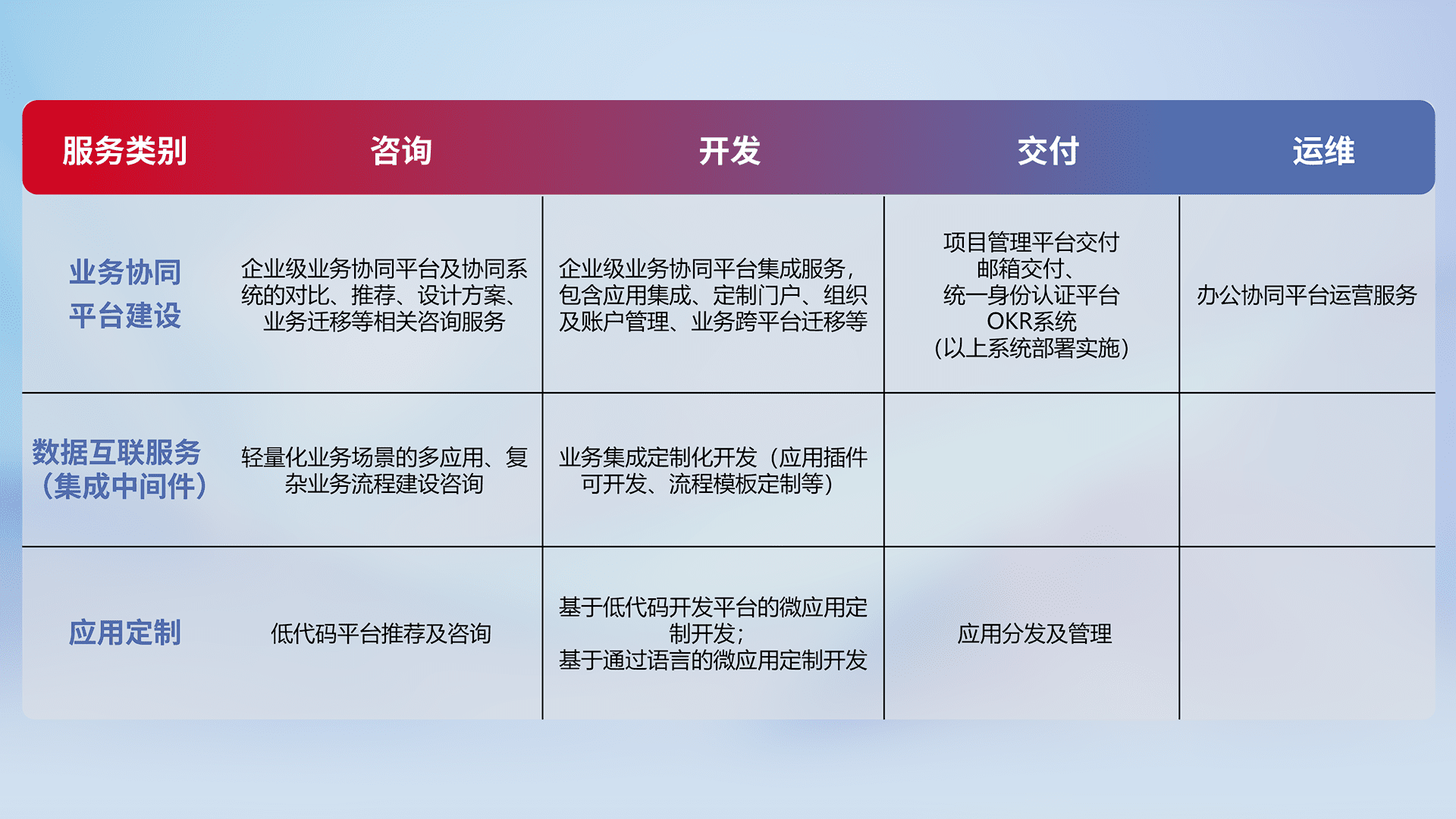 针对钉钉、、企微、、、、IDaas等平台级产品提供产品的规划、、方案、、、交付、、、、定制化开发等服务,,实现如统一协同办公、、、智能客户服务、、混合会议管理、、智能数据查询、、、、等业务场景,,,,实现数字化转型。。